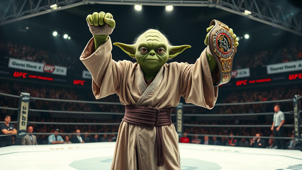 A photo-realistic depiction of a wise and powerful Yoda, standing triumphantly as a UFC champion in the octagonal ring, his small but muscular frame contrasting sharply with the intense spotlight; wearing a custom fighting robe adorned with Jedi symbols, his green skin glistening with sweat, and his expressive eyes showing a mix of determination and serenity; the crowd roaring with awe and respect in the background, as he holds a championship belt high in his three-fingered hand, reflecting both his formidable combat skills and his deep connection to the Force.