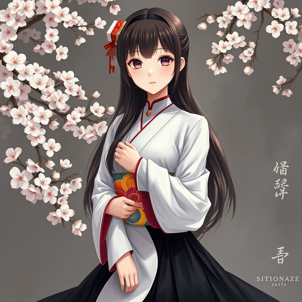 A photo-realistic depiction of an anime girl dressed in an elegant, full white outfit, clutching a colorful Japanese t-shirt, her ensemble completed with a flowing black skirt. Her serene face exudes a sense of tranquility amidst a backdrop of delicate cherry blossoms, painted in the style of traditional Chinese art with a romantic fantasy touch. The scene is imbued with rich dark bronze and gray tones, reminiscent of classic oil paintings, capturing an ethereal beauty and depth.