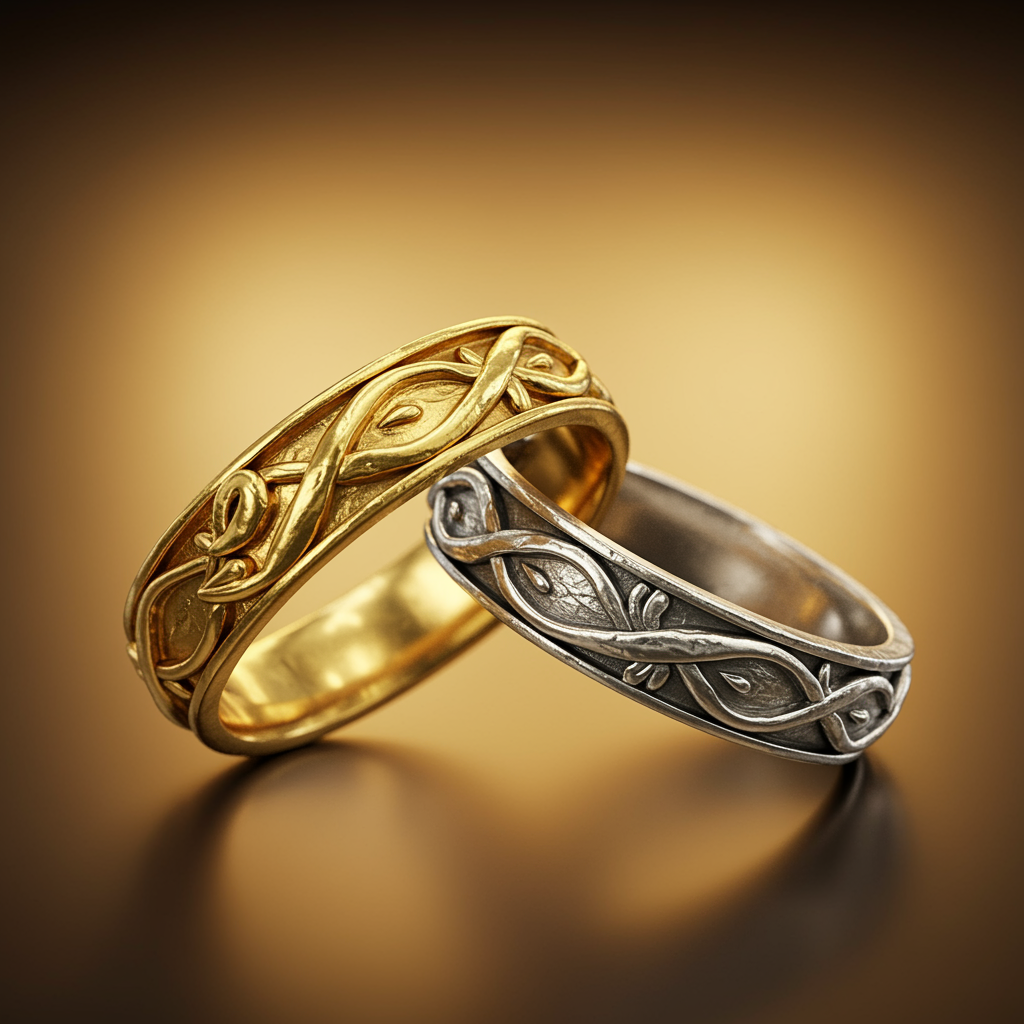 A photo-realistic depiction of intricately intertwined rings, one gleaming gold and the other shimmering silver, set against a warm, softly glowing background. The detailed craftsmanship of the rings captures an exquisite blend of elegance and complexity, their surfaces reflecting subtle textures and minute detailing that suggest a rich history. The interplay of light and shadow accentuates their three-dimensionality, offering a sense of depth and realism that invites a closer look.