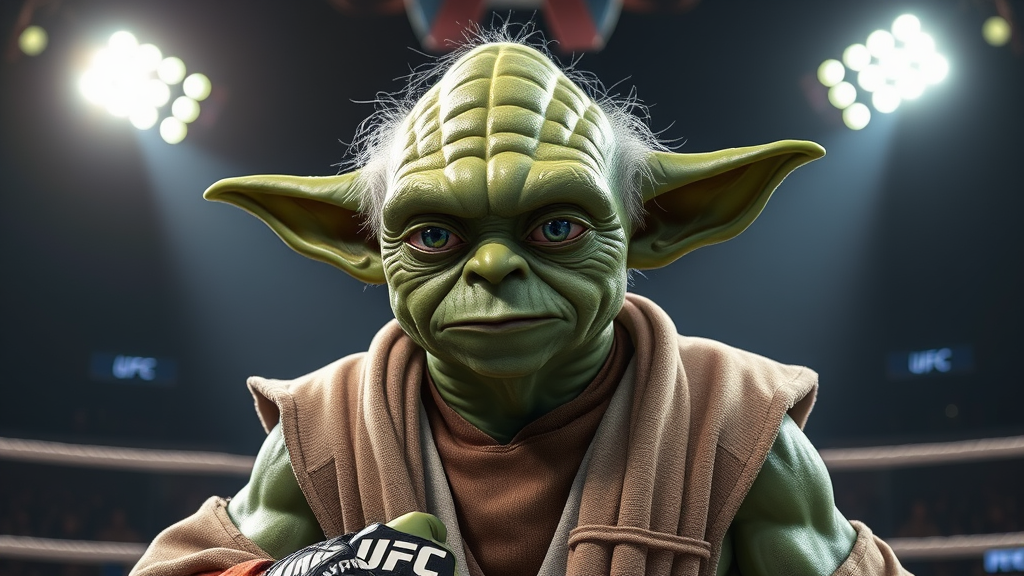 A photo-realistic depiction of Yoda as a UFC champion, blending his iconic wise and serene expression with a muscular, athletic build, dressed in UFC fighting gear with a hint of his traditional Jedi robes integrated into the design, standing confidently in the octagon under bright stadium lights, his eyes focused and determined, showcasing a unique green skin texture glistening with sweat, ropes of the arena visible in the background, evoking a sense of power, wisdom, and grace.