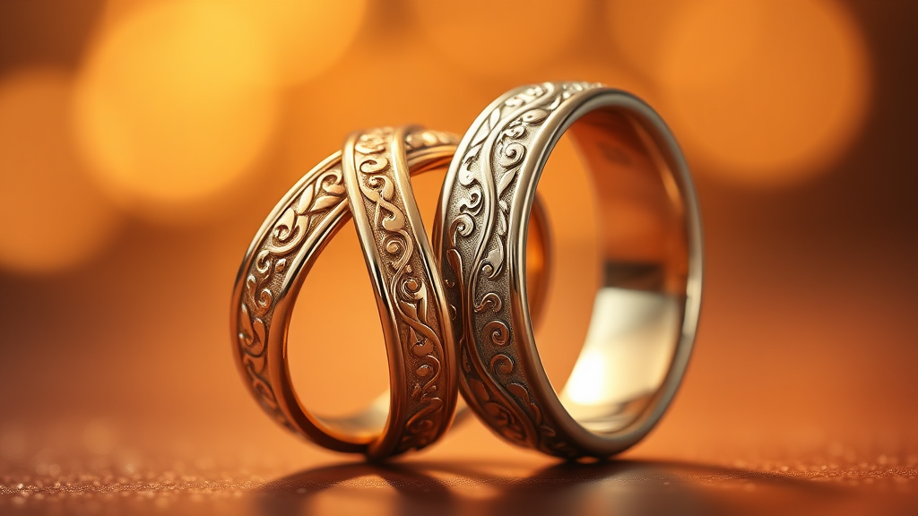 A photo-realistic image of intricately intertwined rings crafted from both gold and silver, set against a warm, softly glowing background. The rings exhibit heavy, detailed engravings that reflect light subtly, showcasing their exquisite craftsmanship. The contrasting metals form a harmonious blend, with fine etchings enhancing their elegance, creating a captivating and timeless expression of unity.