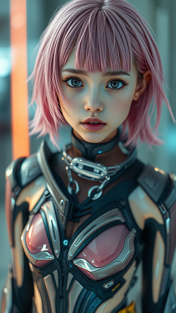 A photo-realistic portrait of a girl with a futuristic outfit featuring an intricate, sleek, and transparent design. She has a young and beautiful face with pink short hair and blunt bangs, a narrow waist, and slender thighs. Her outfit is inspired by Evangelion and cyberpunk styles. The portrait captures artful, messy streaks and extreme detail, with cinematic lighting and sharp focus, offering a DSLR-like depth of field and bokeh effect in UHD, HDR quality. Her textured skin and remarkably detailed pupils add realism, as shot with a high-quality cinematic camera. The overall scene conveys an impressive blend of futuristic and artistic elements without any distracting imperfections.