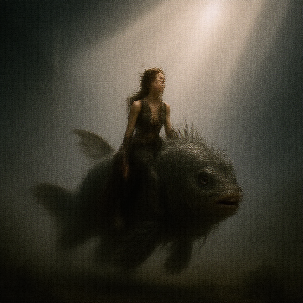 A photograph captures an intricately detailed scene, zoomed out to reveal a slender, toned woman with caramel-colored hair riding a majestic Tilefish. Her honest nose ring glints subtly against her skin, and a burlesque handkerchief adds an element of flair. The setting is beneath an unattractive bridge, surrounded by a dense, fog-covered hillside. Sun rays pierce through the mist, creating a dramatic interplay of light and shadow. The background features a bokeh effect, adding depth and an abstract quality to the composition. The mood is tinged with a sense of melancholy, emphasized by the film grain reminiscent of a Fujifilm XT3 camera with a 50mm lens. The overall aesthetic is akin to a rough sketch, blending elements of concept art and photography into an extremely beautiful, complex piece.