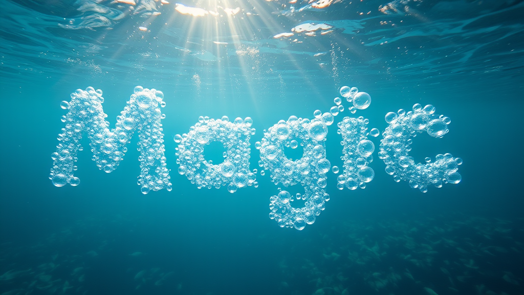 A photograph captures the enchanting word "Magic," formed entirely from shimmering water bubbles. These delicate spheres float gracefully, crafting each letter with ethereal elegance, slowly dispersing in the crystal-clear water. The tranquil underwater backdrop displays a vibrant tapestry of marine life, as sunlight gently seeps through the water’s surface, illuminating the scene with a warm glow. This image radiates a mystical charm, evoking feelings of wonder and fascination. The overall composition is harmonious, with no intrusive elements like text logos or watermarks to distract from its beauty.