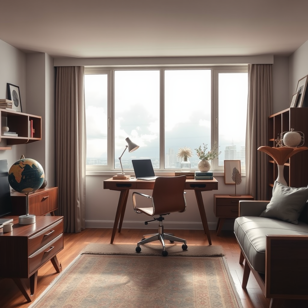 A photograph capturing a cozy home office with mid-century aesthetic, featuring a large window overlooking a cloudy sky, filling the room with diffused, warm white light. The space is inviting, decorated with carefully chosen objects, including a vintage globe and a sleek vase, both discreetly positioned to add character without cluttering, the smooth wooden furniture complementing the serene atmosphere, enhancing the feeling of comfort and creativity.