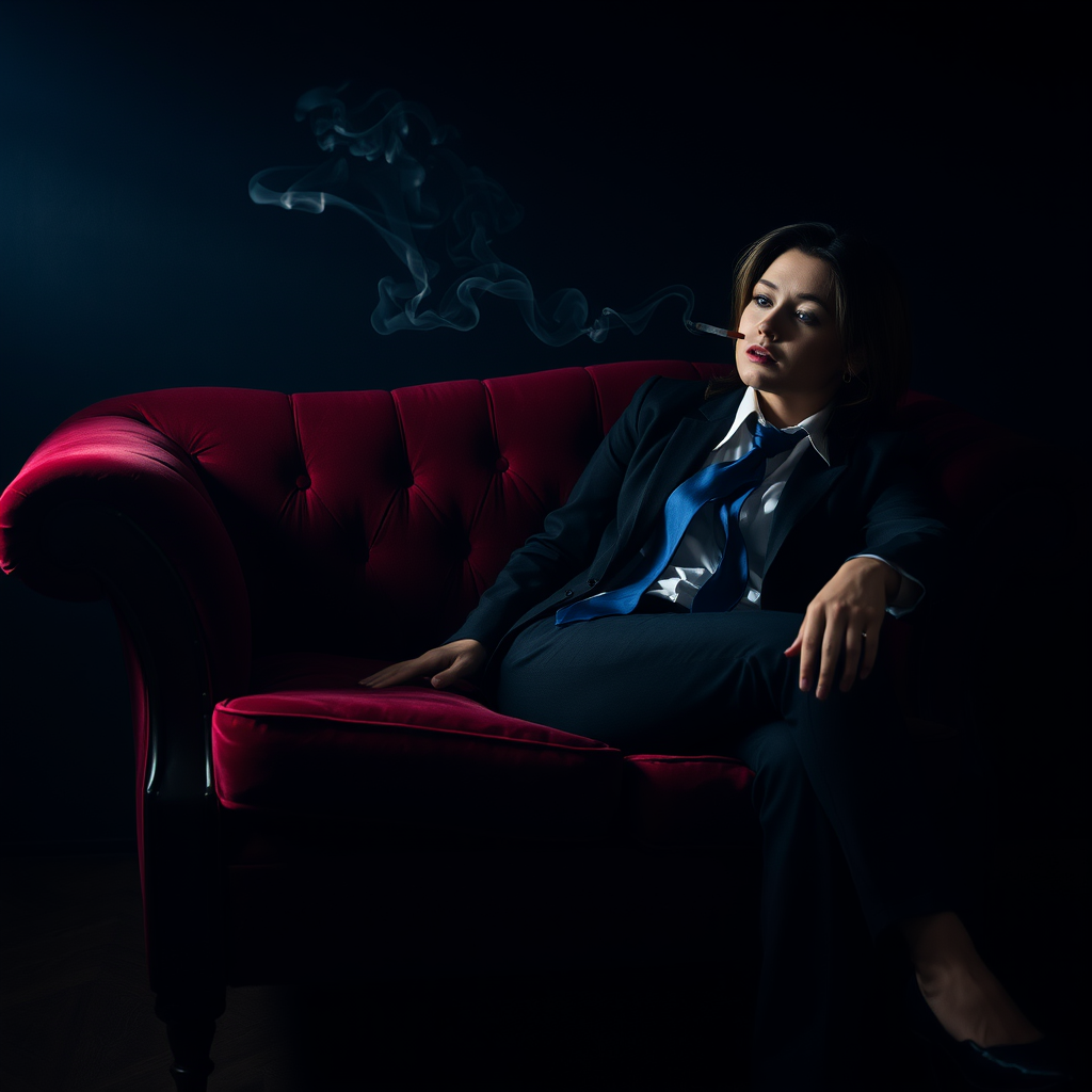 A photograph capturing a dimly lit room with an enigmatic atmosphere, featuring a female figure reclining on a deep crimson vintage couch. She is dressed in a sharp black suit, a crisp white shirt, and a loosely knotted blue tie. Her arm rests casually on a bent knee while her hand, holding a glowing cigarette, creates a swirling trail of smoke. The smoke dances through a path illuminated by a mysterious beam of light from an undisclosed source, casting intricate patterns through the haze. The scene exudes a moody, cinematic quality with high contrast, with the soft glow contributing to an aura of reflection and introspection. The woman exudes an air of contemplation, enhancing the intimate mood of the portrait.
