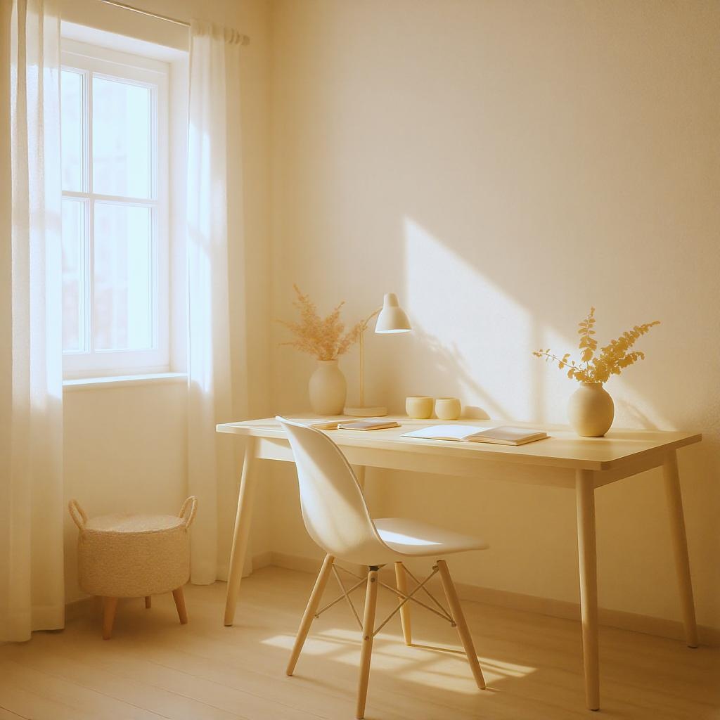 A photograph capturing a minimal home office bathed in soft sunlight, complemented by warm artificial light that casts a welcoming glow, creating a cozy and inviting atmosphere. The space features a carefully arranged table with subtly placed decorative objects, evoking a sense of tranquility and focus in a harmonious blend of natural and gentle warm white hues.