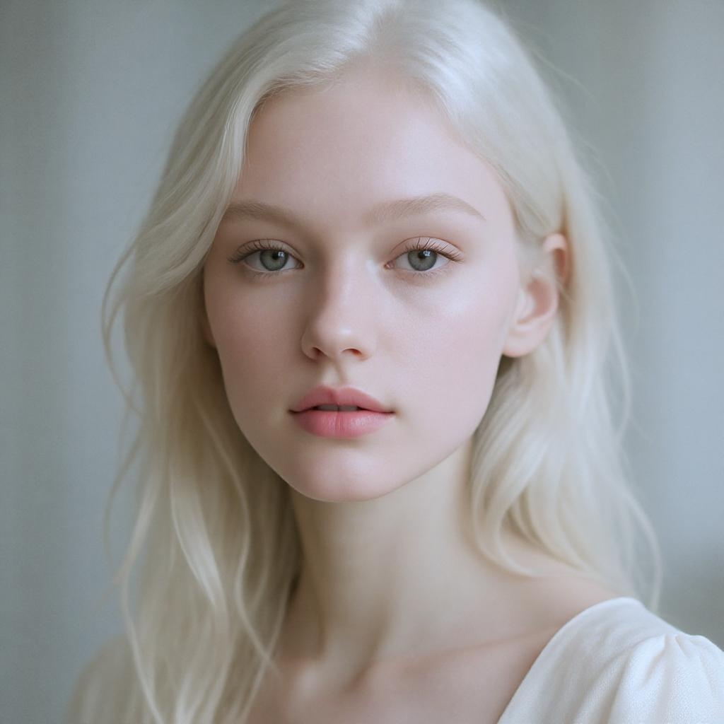 A photograph capturing a young female model with pale blonde hair, photographed using a 250mm lens at f/4.5. The image is softly focused, enveloped in gentle natural light, showcasing her in hues of soft silver and pearl white.
