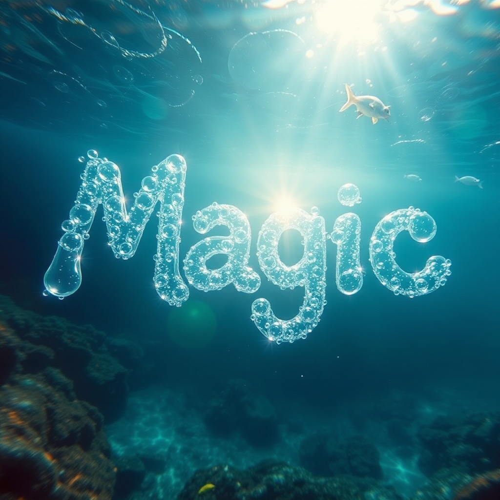 A photograph capturing the essence of the word "Magic" beautifully crafted from shimmering water bubbles. The elegant, ethereal bubbles form each letter with grace, slowly dispersing in the tranquil, crystal-blue water. The serene underwater scene is enriched with a vibrant tapestry of marine life, while sunlight streams through the water's surface, illuminating the spectacle. This image radiates a mystical charm, evoking a sense of wonder and enchantment.