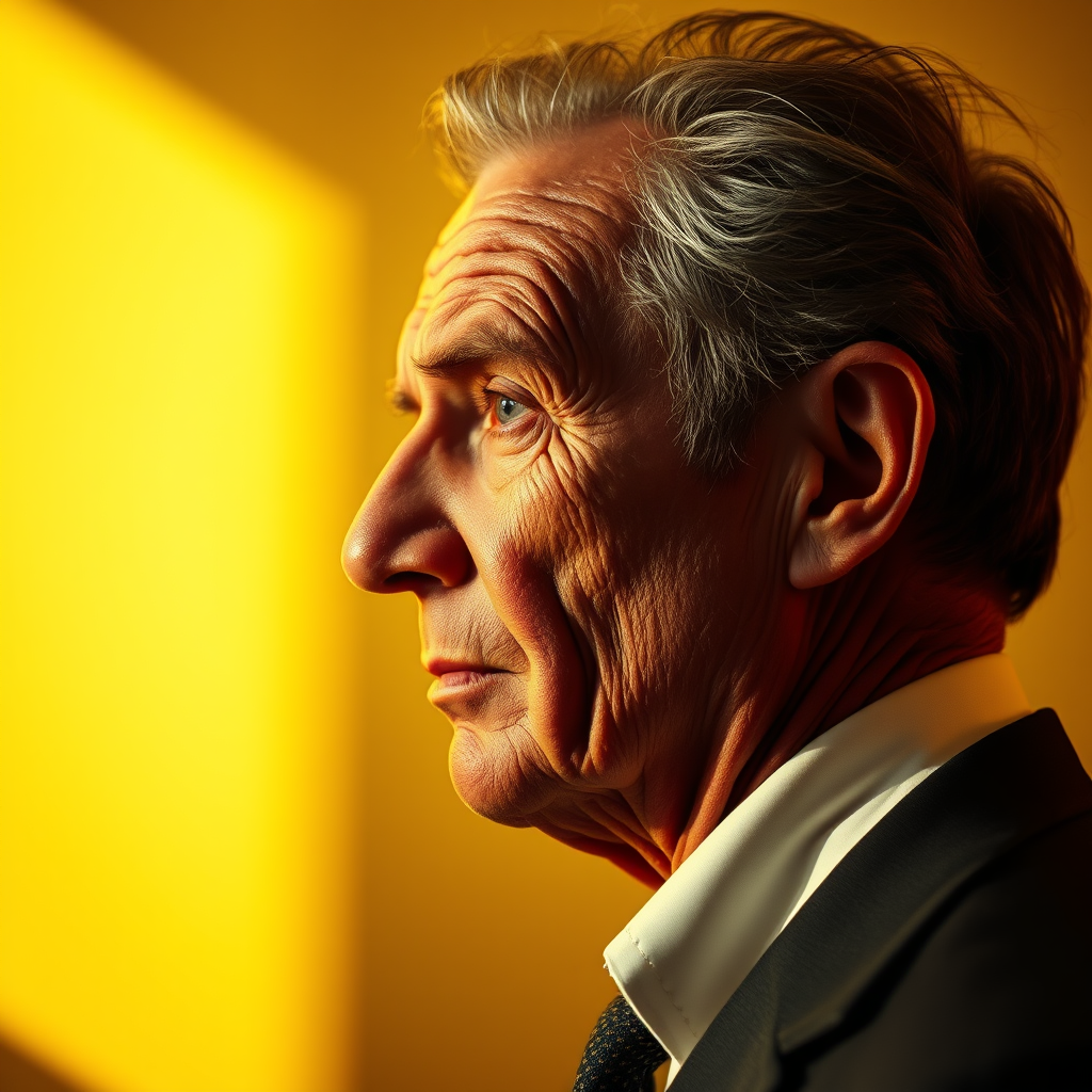 A photograph of a head-on profile of a middle-aged man with deep grooves etched into his weathered skin, set against a vibrant, electric yellow backdrop that leaves the upper torso and hair blurred, isolated in a shallow depth of field created by an aperture of f/2.8, the edges of the silhouette glowing with a subtle warmth as the background gradates to a steely gray near the edges, while the man's features, including piercing blue eyes, a sharp nose, and a strong jawline, are heightened in contrast by the brightness, creating an explosion of definition in the shape of shadows cast inward onto his face. Coarse, natural light, possibly coming from the side or above, imbues the skin with an organic, dimensionless sheen, rustling the fine lines and veins of his nose, lip creases, and creases around the eyes, illuminated in UHD 9:16, ISO 100, and chaos 1.7 raw mode, preserving the rich, raw tones of his skin and the resin yellow surroundings. His suit ruffles softly, as if capturing the murmurs of gentle motion, visualized through advanced optics akin to extreme close-up lens rig capture, self-exaggerating an already intense, challenging perspective. Subtly offset from the frame, telling a story of freedom, edges becoming devoid of distracting background energy entirely.