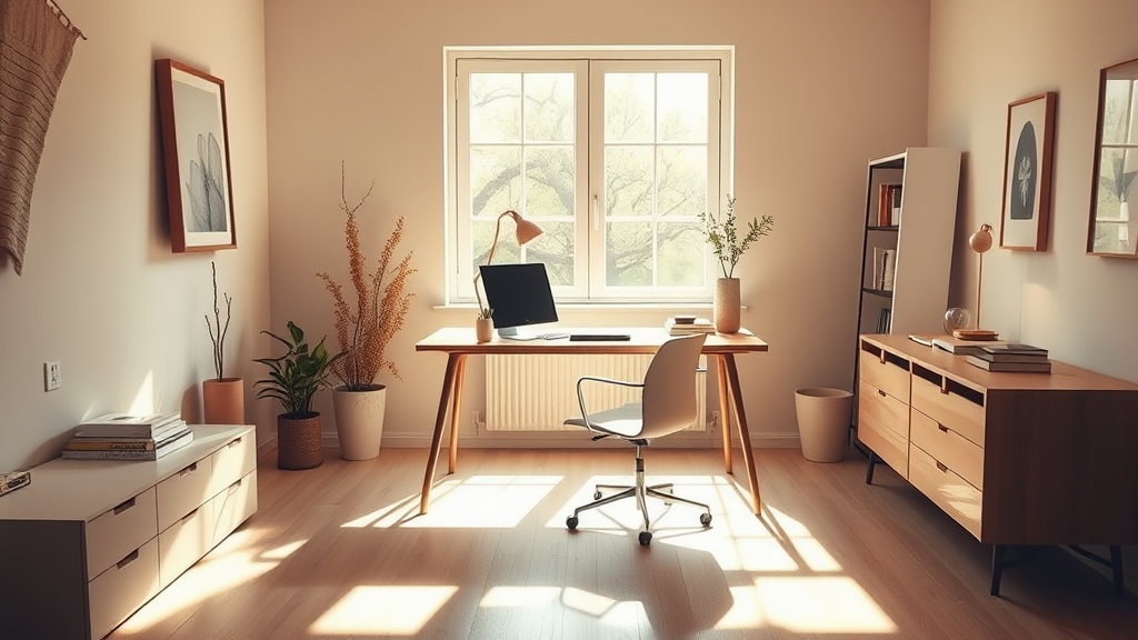 A photograph of a minimalist home office bathed in soft sunlight and complemented by warm artificial light, creating a cozy and inviting atmosphere. The space features an elegant desk, with a modern chair, and subtle decor, including a few discreetly placed objects that add character without clutter. The color palette is warm white with earthy tones, and the lighting casts gentle shadows, enhancing the serene and focused ambiance. The overall composition maintains a raw, authentic feel, capturing the essence of a harmonious workspace.