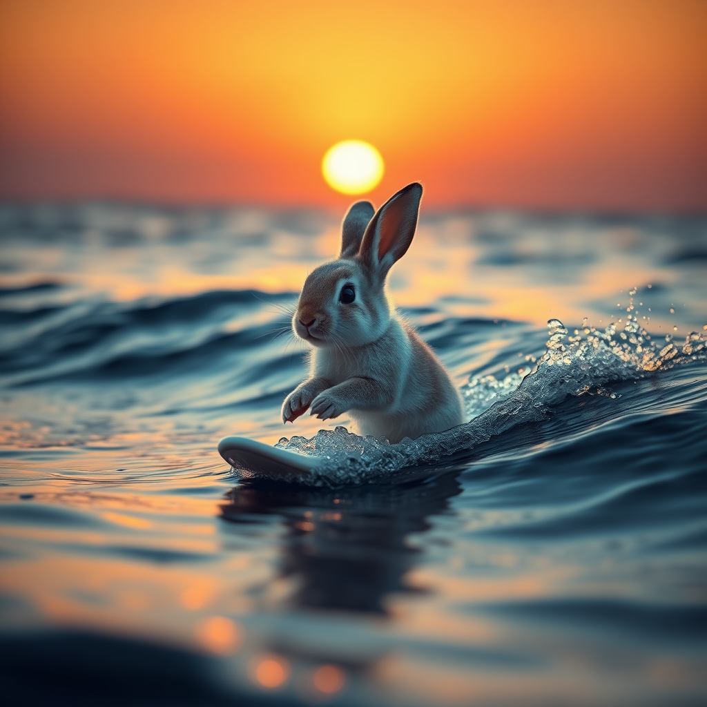 A photorealistic 32k image depicting a baby bunny elegantly riding a wave, illuminated by cinematic lighting that captures the golden hues of a breathtaking sunset, with the sun dipping into the horizon, casting a warm glow across the rippling water and creating long, soft shadows that enhance the whimsical scene.