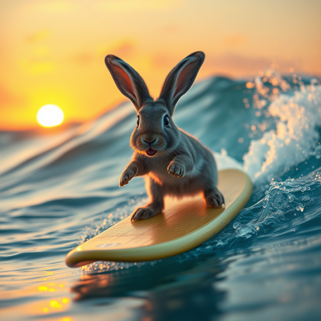 A photorealistic 32k image of a baby rabbit expertly riding a surfboard on a crystal-clear wave, illuminated by cinematic lighting that highlights the golden hues of a breathtaking sunset in the background, with a touch of ocean spray catching the warm, glowing light as the bunny joyfully surfs with its fluffy ears flapping in the breeze.