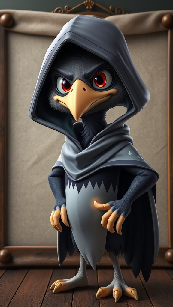 A photorealistic 3D cartoon illustration of a kenku character, wearing a mysterious hooded cloak, standing confidently on a canvas frame backdrop. This bird-like humanoid, with glossy feathers and sharp eyes, exhibits a mischievous grin, hinting at its cunning nature. The folds of the hood add depth and intrigue, while subtle magical symbols glow faintly on its cloak, all enveloped in an atmosphere of enchanting mystery.