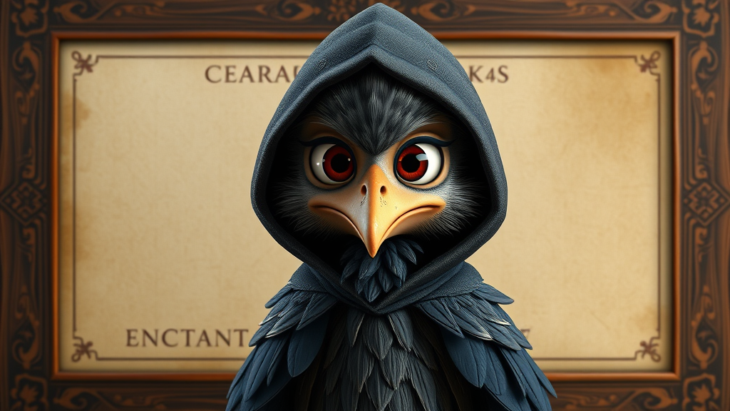 A photorealistic 3D cartoon of a kenku character wearing a mysterious hood, standing on a canvas frame background. The kenku has intricate feather details and expressive eyes, with a slightly mischievous expression. The hood is dark and slightly shadowed, creating a sense of mystique, with subtle textures and patterns that enhance its enchanting aura. The canvas frame has a warm, earthy color palette, and it subtly integrates elements of a fantasy world, such as magical runes and hints of ancient maps, adding depth to the character's adventurous background.