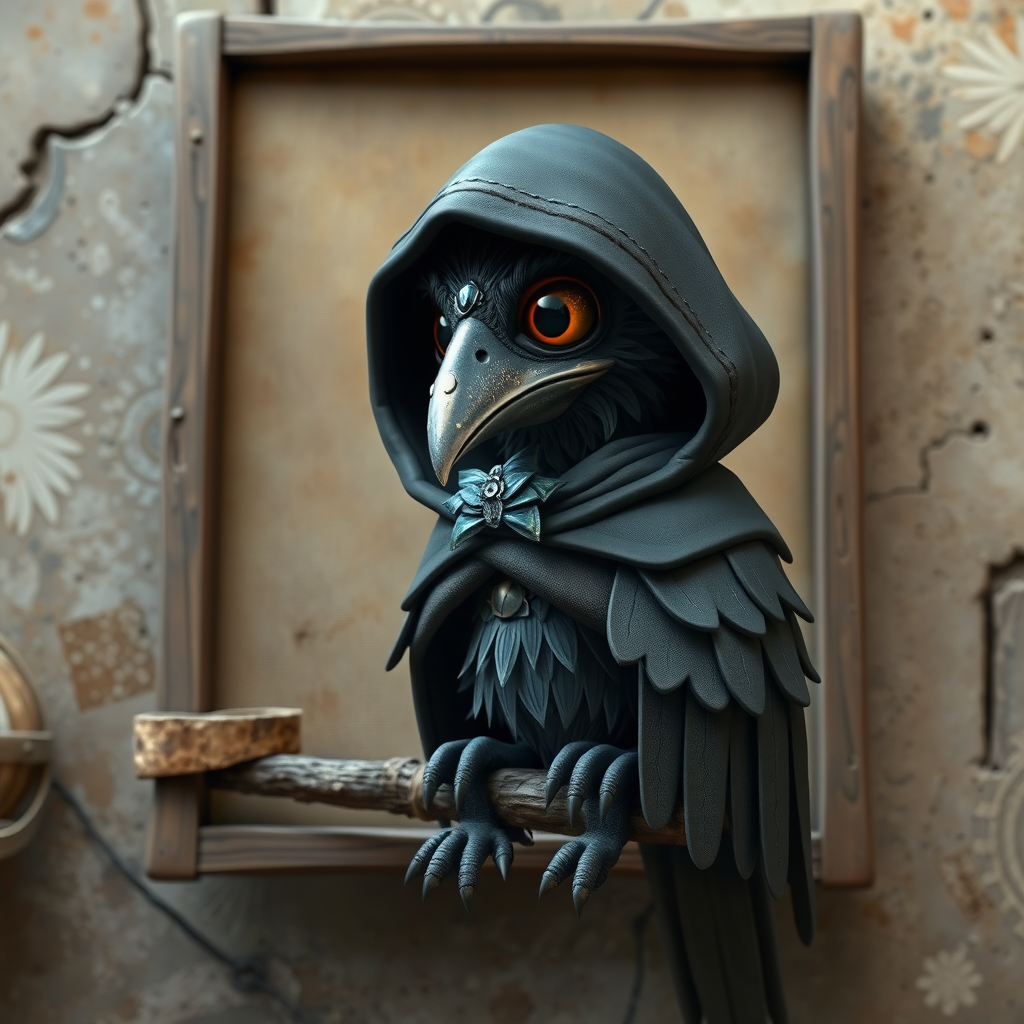 A photorealistic 3D cartoon of a kenku wearing a mysterious hooded cloak, perched thoughtfully on a rustic canvas frame, its intricately detailed feathers subtly gleaming. The scene captures a curious blend of fantasy intrigue and whimsical charm, with a backdrop hinting at an adventurous D&D world.