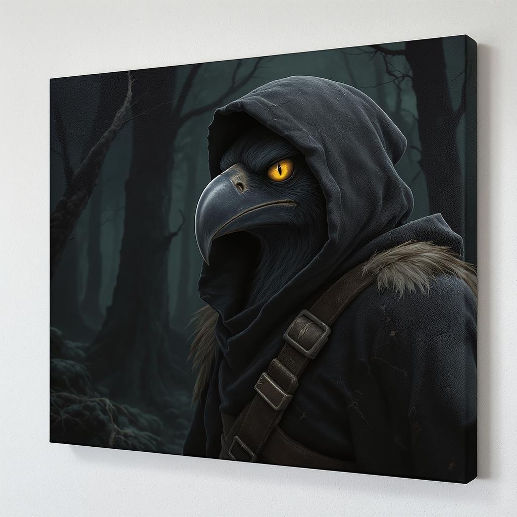 A photorealistic 3D cartoon rendering of a Dungeons & Dragons character featuring a kenku standing in a mysterious forest. The character wears a deep hood, casting shadows over cautious, intelligent eyes that peer out vigilantly. Subtle feathers peek from beneath the hood, hinting at the kenku's avian nature. The cloak's texture is rugged, weathered by countless adventures, and the character's stance exudes agility and cunning. This scene is captured on a canvas frame, blending realism with a touch of fantasy allure.