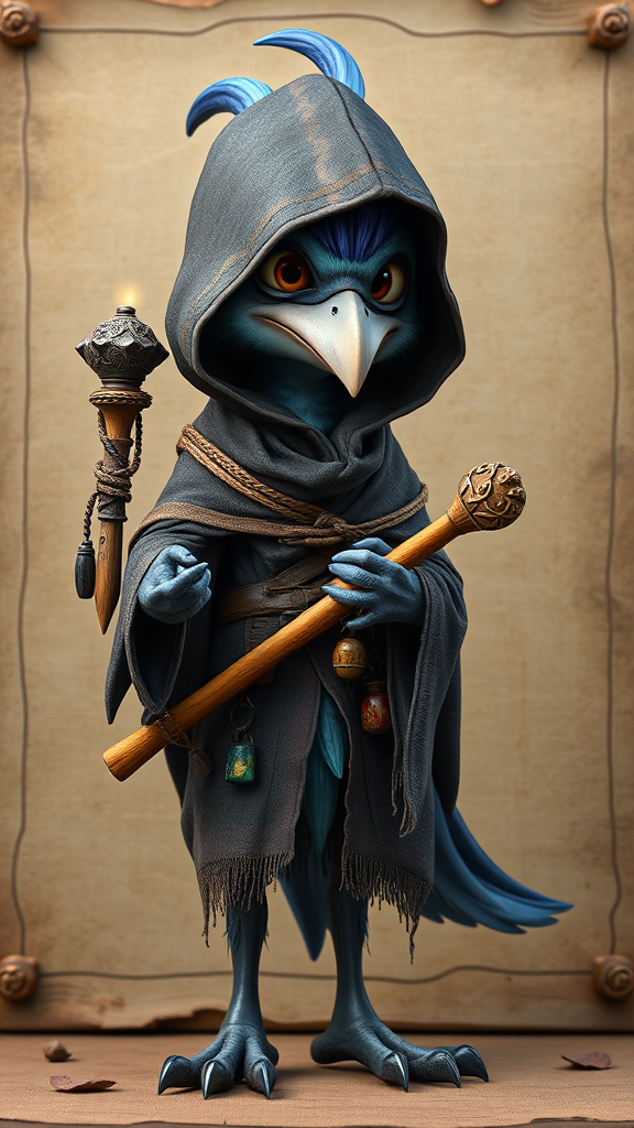 A photorealistic 3D depiction of a Kenku character dressed in a tattered hooded cloak, standing on a canvas frame background; the character's bird-like features are cartoonishly exaggerated with beady eyes and a sharp beak, their plumage a mix of iridescent blues and purples; they clutch a wooden staff adorned with trinkets, casting a mysterious yet whimsical aura.