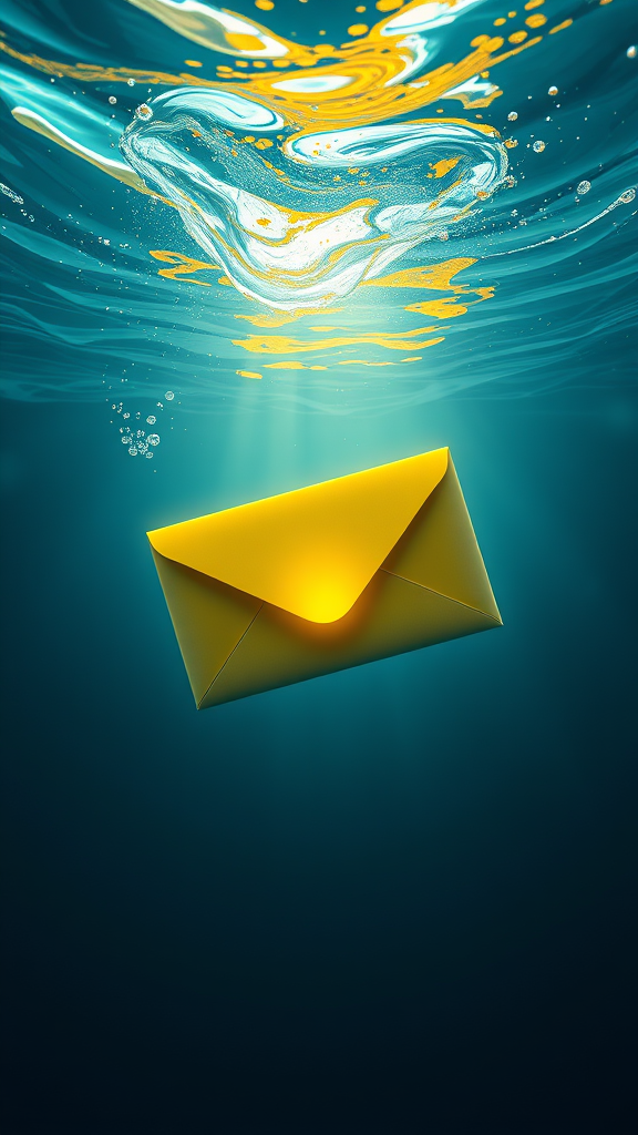 A photorealistic 3D render of a single letter enveloped in a captivating blend of periwinkle and canary yellow hues, submerged beneath swirling water currents. Bright light radiates from the center, creating an eerie atmosphere with high contrast. The rippling water surface features hyper-detailed textures, and the scene is dramatized with striking lighting. Rendered in ultra-high 8K resolution, capturing every liquid effect, the artwork presents a mesmerizing underwater vista with subtle adjustments for enhanced creativity.