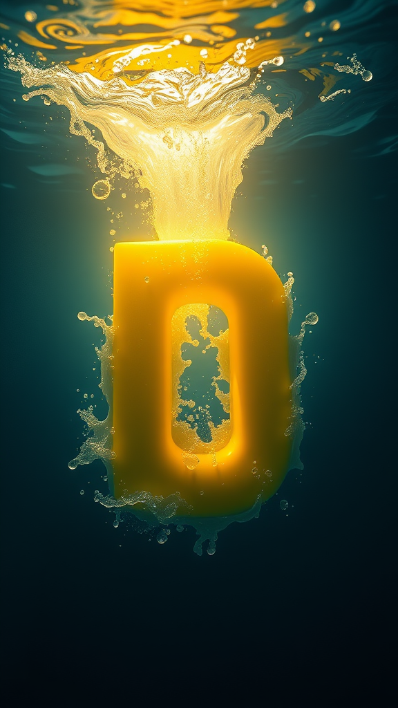 A photorealistic 3D render of a single letter in a mesmerizing blend of periwinkle and canary yellow colors, submerged under swirling water currents. Emanating from the center is a bright, ethereal light that casts an eerie atmosphere throughout the scene. The high-contrast composition features meticulous detail, capturing the rippling water surface and liquid-like effects with hyper-detailed water textures. The dramatic lighting enhances the scene, producing an almost otherworldly glow. This imagery is captured in stunning 8K resolution, presenting a raw, immersive experience that captivates the senses.