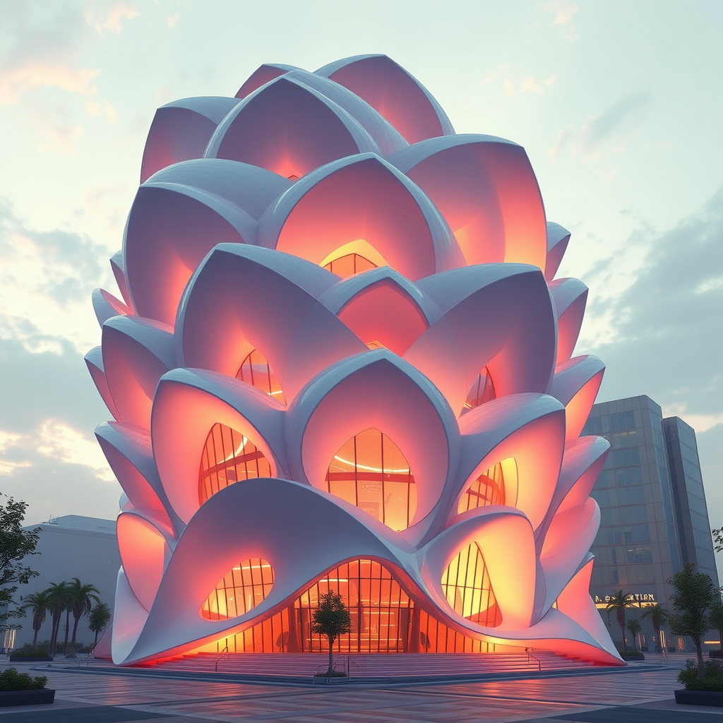 A photorealistic 3D rendering of a building inspired by the layered structure of a rose flower, echoing Zaha Hadid's architectural style. Created in Unreal Engine with ray tracing and post-processing, utilizing ZBrush and Substance Painter for texture detailing. This visualization is trending on ArtStation, featuring cinematic lighting and composition, following the rule of thirds. The scene is depicted with ultra-detailed, low contrast, and natural lighting, enhanced by a realistic light fog and atmospheric elements. It showcases hyperrealistic volumetric lighting, achieving ultra-photo-realism, rendered in Unreal Engine 5 with a 35mm lens aesthetic. The presentation includes matte painting and movie concept art influences, being hyper-detailed and extremely intricate. Rendered using Corona, Octane, and Redshift renderers, the final output is at 8k resolution.