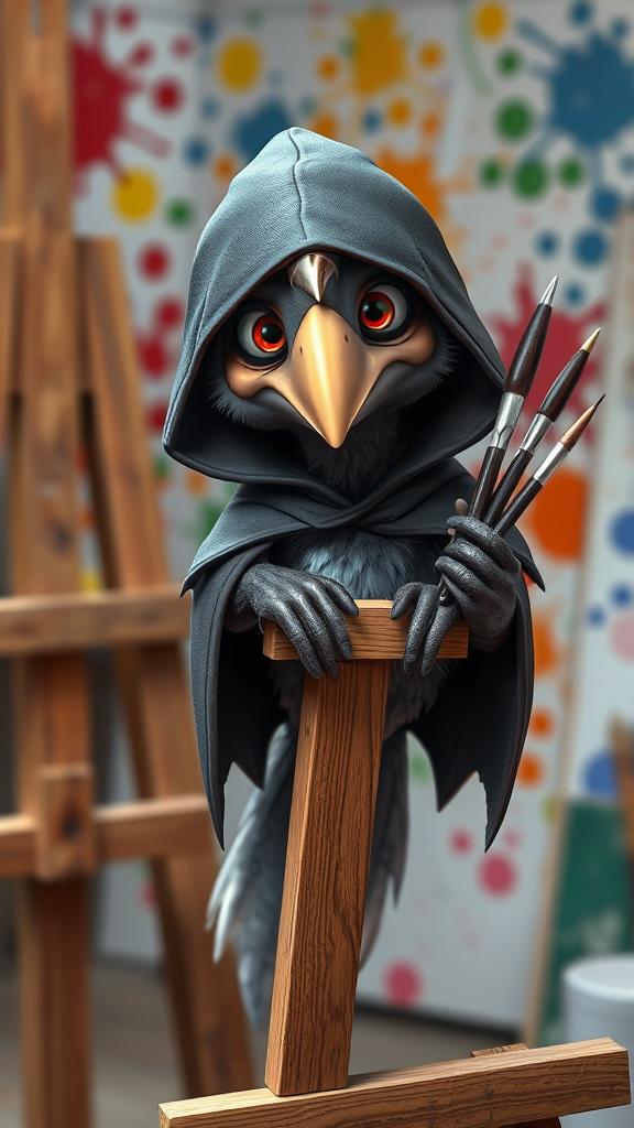 A photorealistic 3D rendering of a cartoonish Dungeons & Dragons kenku character, dressed in a mysterious hooded cloak, perched on a wooden canvas frame. The setting is a vibrant artist’s studio, with colorful paint splatters in the background. The kenku’s eyes gleam with curiosity, its feathered features detailed and lifelike, while it mimics the artistic tools around it, adding an element of playful intrigue to its mischievous demeanor.