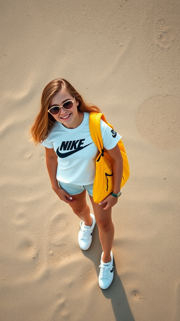 A photorealistic 8k image featuring a fashion-forward American girl on a beach, captured in full scale. She sports a white T-shirt with a stylized Nike logo, paired with white sneakers. Her outfit is complemented by fashionable sunglasses and a striking yellow backpack. The scene is shot from above, embracing the concept of knolling, where elements are laid out neatly and organized. The main color theme is vibrant, centered around #ff7ad2, bringing a lively energy to the composition. The image serves as a data visualization, seamlessly integrating text descriptions and visual elements to narrate a cohesive story.