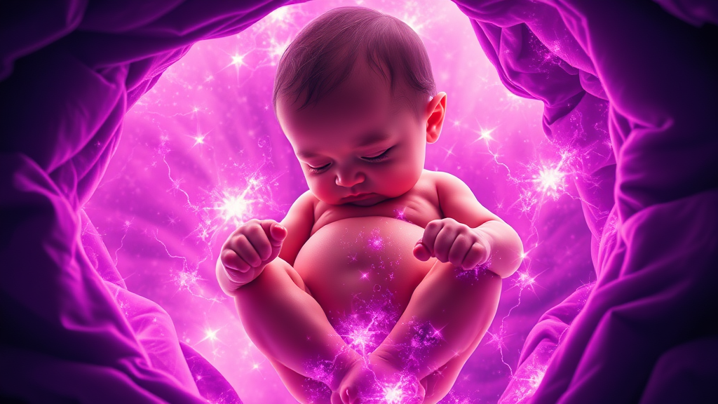 A photorealistic and intricately detailed depiction of a baby in the womb, enveloped in magical purple plasma and energy. The full-body portrait is captured from an ultra low angle, showcasing clenched fists, and is rendered with fine sketching and dynamic composition. The visual style is inspired by Ghibli cinematic and the artistry of Ayami Kojima, producing a highly detailed 16k resolution image with UHD and HDR qualities. The scene is infused with a sense of wonder and beauty, highlighting the preciousness of the unborn life surrounded by shimmering energy. The composition is wide angle, balancing realism with artistic flair, ensuring a captivating and emotive experience.