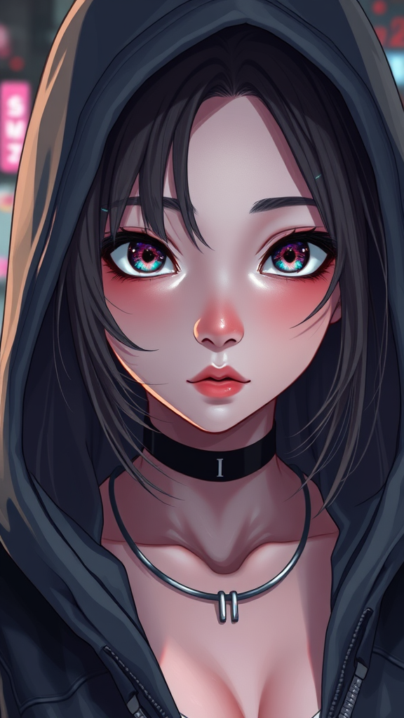 A photorealistic anime girl with a sleek cyberpunk vibe, her expressive eyes framed by the shadows of her oversized hoodie, complemented by a stylish choker. Rendered in an 8k resolution with intricate details, her appearance is a striking blend of anime aesthetics and realism. Inspired by the artwork style of Guweiz, this 3D-rendered character art captures a captivating portrait, embodying the essence of anime realism and futuristic flair. The scene is exquisitely detailed, showcasing a mesmerizing balance between vivid anime color palettes and the atmospheric depth of a cybernetic world, perfect for an eye-catching fanart on ArtStation.