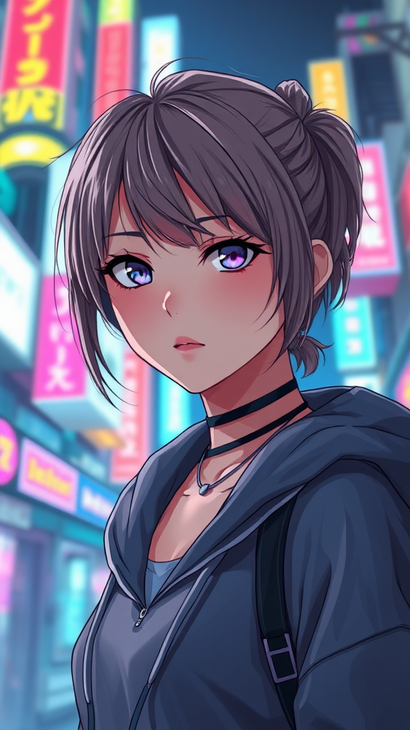 A photorealistic anime girl with a sleek, futuristic look stands against a neon-lit cyberpunk backdrop. She wears a stylish hoodie and a sleek choker, her intense eyes reflecting vibrant city lights. Her character design is inspired by the intricate and detailed artwork of Guweiz, rendered in stunning 8k resolution. Her slightly tousled hair frames her face, adding a touch of realism to her anime-inspired features. This anime realism style, with its detailed portrait, captures the essence of high-quality fanart found on art platforms, blending anime style with realistic art techniques for a captivating visual.