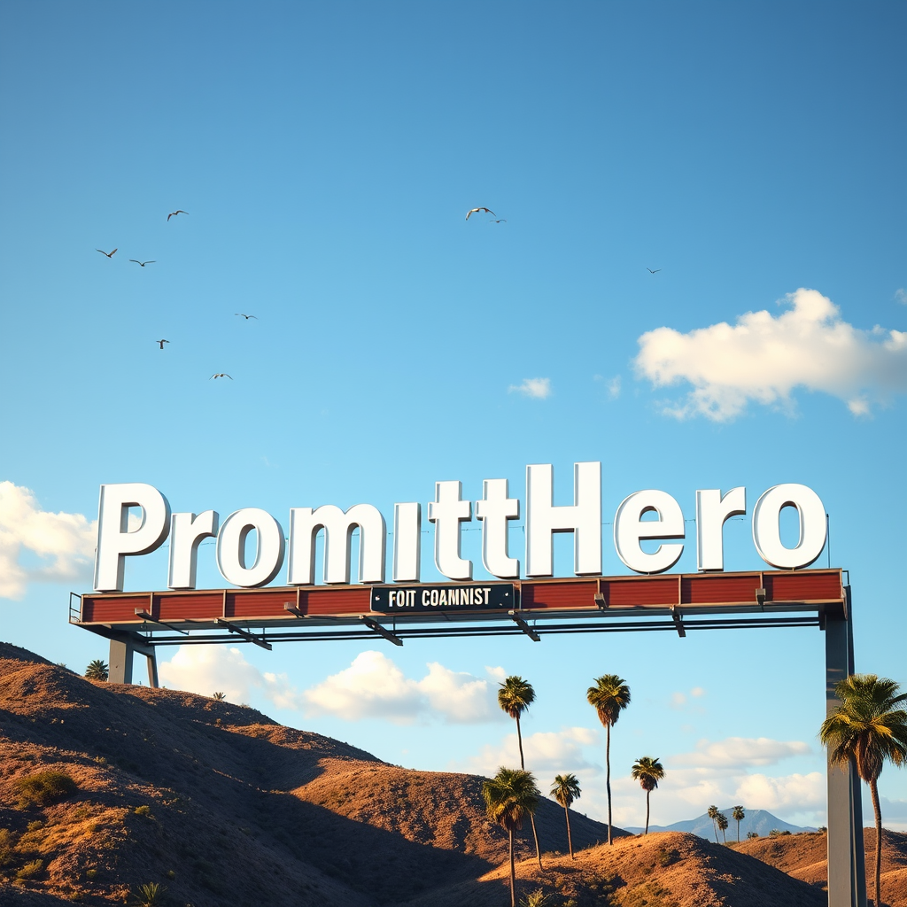 A photorealistic billboard set against the backdrop of rolling Los Angeles hills, resembling the iconic Hollywood sign. The letters spell "PromptHero" in bold, white, three-dimensional lettering, slightly curved to mimic the landscape. Sunlight casts dramatic shadows on the letters, while a few scattered clouds drift in a bright blue sky. A group of palm trees sways gently in the distance, and a flock of birds can be seen flying overhead, enhancing the grandeur of the scene.