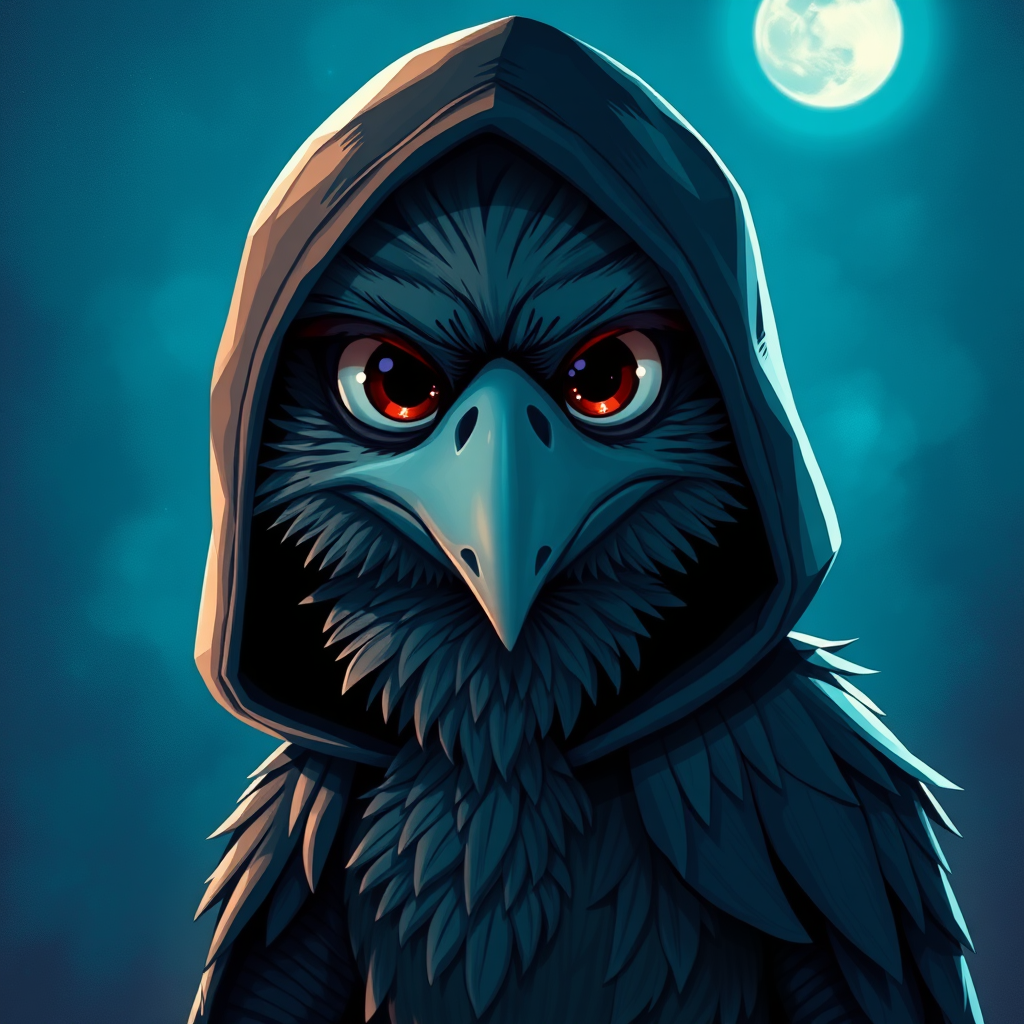 A photorealistic cartoon depiction of a D&D character, featuring a kenku with realistic feathers and intricate textures, wearing a shadowy hood under the moonlight. This mysterious avian figure stands against a vibrant canvas background, with a 3D effect that brings their expressive eyes and beak into sharp focus, while subtle reflections of stars twinkle in their dark eyes, adding an air of enigma and adventure.