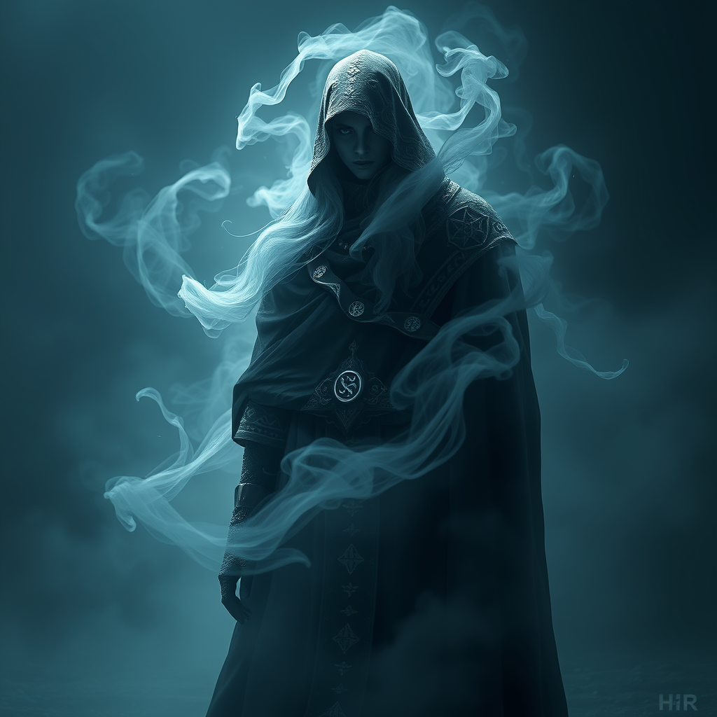A photorealistic character design of a void arcanist cloaked in swirling mist, rendered with stunning clarity through octane render and unreal engine. The scene is hyper detailed, featuring volumetric lighting that creates dramatic contrasts and illuminates the character's ethereal presence with hdr precision. The void arcanist stands in a mystical landscape, their gaze piercing through the mist, with arcane symbols faintly glowing on their robes. The atmosphere feels otherworldly and enigmatic, as the mist curls around the arcanist, accentuating their connection to the void. The scene is composed with an aspect ratio of 9:16, adding a vertical depth that reflects the towering and enigmatic aura of the character.