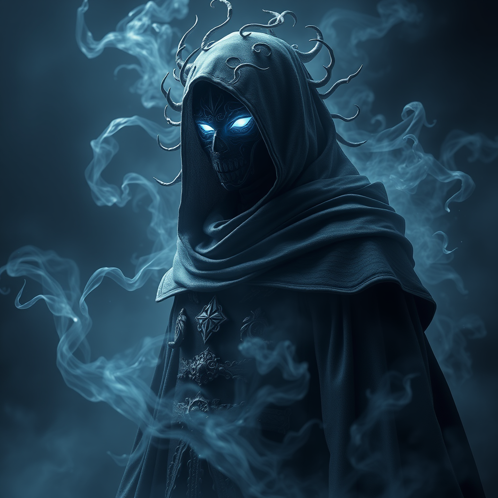 A photorealistic character design of a void arcanist shrouded in ethereal mist, intricately detailed with hyper-realism. The scene is rendered using Octane Render and Unreal Engine, featuring volumetric lighting and HDR effects to enhance the mystical atmosphere. The arcanist is adorned in arcane robes, with dark swirling patterns reminiscent of cosmic nebulae. Their eyes glow with a mysterious light, casting an aura that merges seamlessly with the surrounding mist. The setting is an enigmatic void, with tendrils of mist dancing around, creating dynamic movements that reflect off the arcanist's attire.