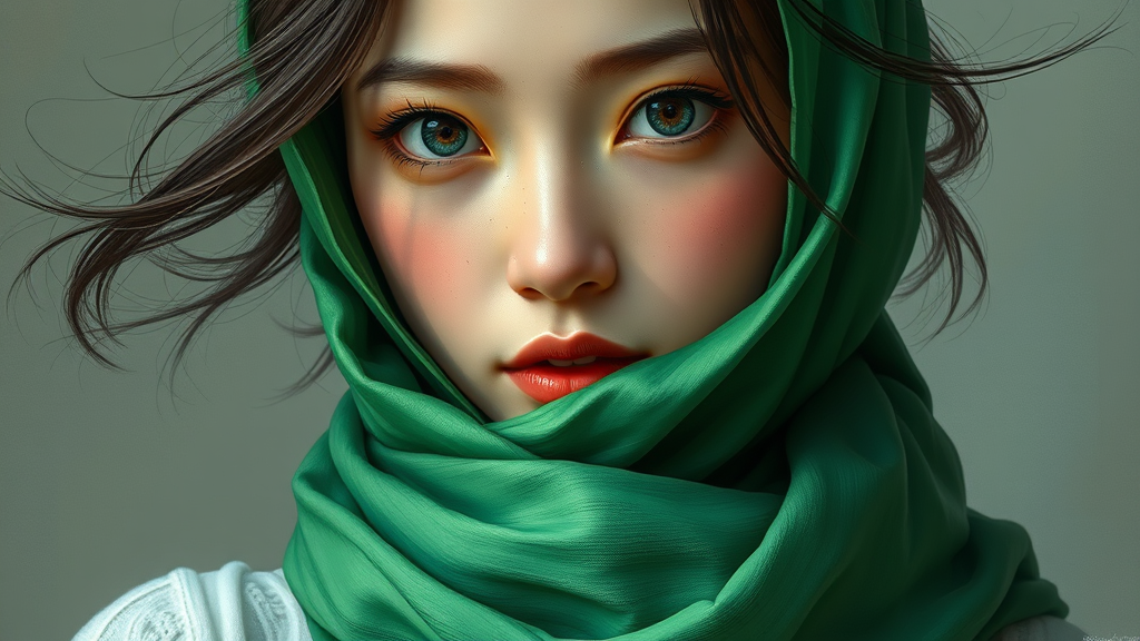 A photorealistic character portrait of a woman wearing a vibrant green scarf elegantly draped around her neck, inspired by Sim Sa-jeong, with influences from Ilya Kuvshinov's style, showcasing intricate details and subtle textures. Her expressive eyes and soft features are captured in a high-definition, detailed painting reminiscent of CGSociety and ArtStation masterpieces, while a gentle breeze adds a dynamic element, subtly lifting the edges of the scarf.
