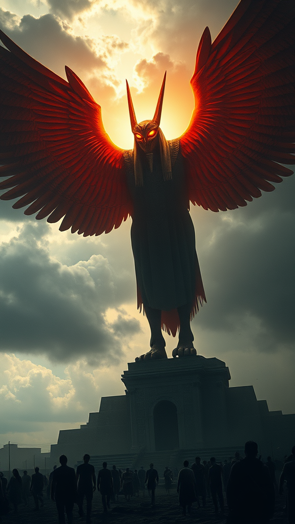 A photorealistic cinematic scene depicting the Egyptian god Horus unleashing his wrath upon humanity with a sinister aura. His eyes glow with an otherworldly light as he towers over the landscape, wings spread wide and casting ominous shadows. The sky churns with dark clouds, reflecting his anger, while the ground trembles under his gaze. Humans are scattered in the foreground, illustrating the contrast between their frailty and his divine power. The atmosphere is tense and charged with a sense of impending doom.