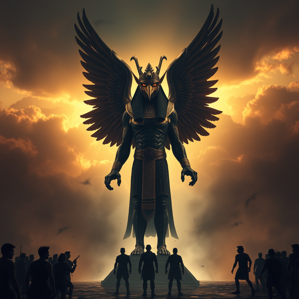 A photorealistic cinematic scene depicting the Egyptian god Horus unleashing his wrath upon humanity, casting a dark and sinister aura. His piercing eyes are filled with ancient fury as he stands tall, wings spread wide against an ominous sky. The ground trembles beneath his feet, symbolizing his formidable power. Humanity cowers in the face of this divine retribution, their silhouettes dwarfed by the god's majestic and fearsome presence.