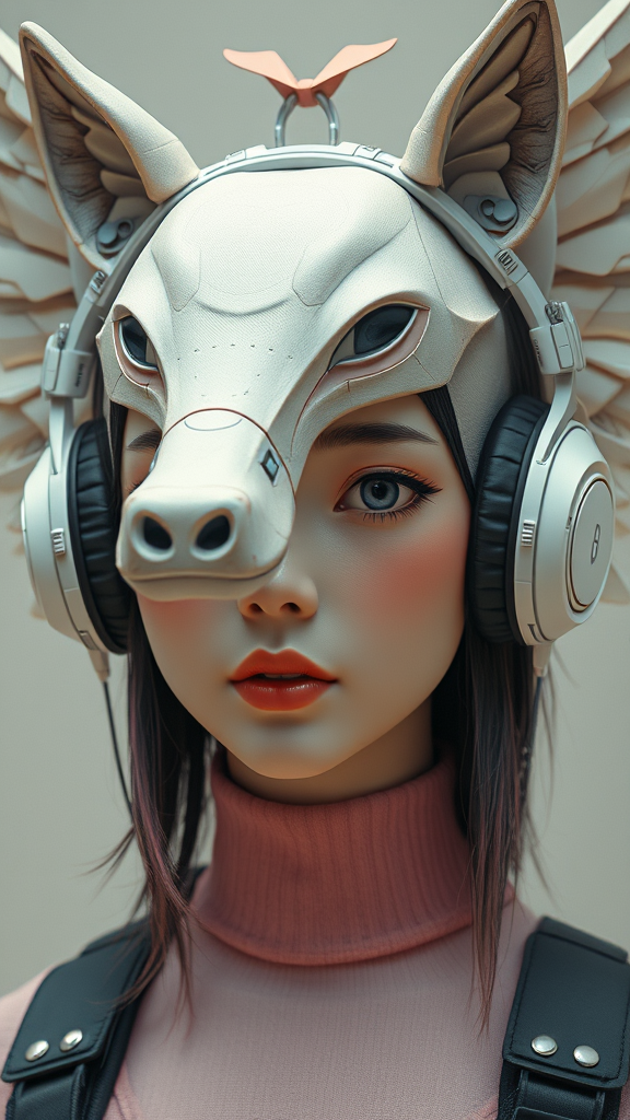 A photorealistic close-up of a person with intricately designed winged headphones, blending elements of surreal sculpture and pastel colors. Inspired by Jeonseok Lee, the image features a modernist twist on the classic Korean Audrey Hepburn look, reimagined as a lifelike automaton. Set in 2020 fashion, the headphones draw from game character designs, offering a full view of both body and head, reminiscent of Sascha Schneider's work. The person's head takes on an animalistic style, merging realistic cartoon features with an airbrushed finish. The scene is mind-bending, depicting a hybrid human/tank concept, and is adorned with a unique hairband element, exploring new boundaries of imagination.