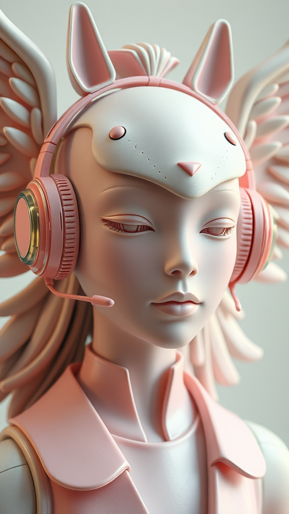 A photorealistic close-up of a surreal sculpture featuring a person with winged headphones, in pastel colors, inspired by Jeonseok Lee. The design combines modernist headphones with elements reminiscent of a Korean Audrey Hepburn automata, styled in 2020 fashion with a nod to game character headphone designs. Featuring a full body and head view, in the style of Sascha Schneider, the piece has an animalistic head style, merging realistic cartoon elements with a mind-bending airbrushed finish. The figure presents a hybrid human/tank concept, adorned with a unique hairband, blending the fantastical with contemporary fashion aesthetics.