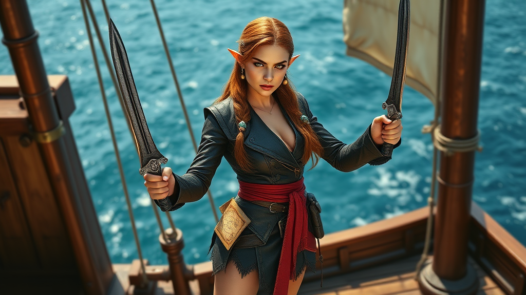 A photorealistic depiction of a fierce female elf pirate, standing confidently on the deck of a ship with the ocean in the background. Her pointed ears are adorned with small golden earrings that glint in the sunlight. She wears a tailored, dark leather outfit with intricate embroidery, suitable for both agility and style, complemented by a crimson sash tied around her waist. Her long, flowing hair, the color of deep chestnut, is partially braided, with a decorative silver hairpiece shaped like a kraken. Her piercing green eyes, full of determination and wisdom, scan the horizon. In one hand, she holds an ornately engraved cutlass, and a map with arcane symbols is tucked into her belt. Her boots, sturdy yet elegant, are suited for both sea and land adventures. The ship's wooden deck beneath her feet and the ship's sails billowing above add to the dynamic and adventurous atmosphere of this captivating scene.