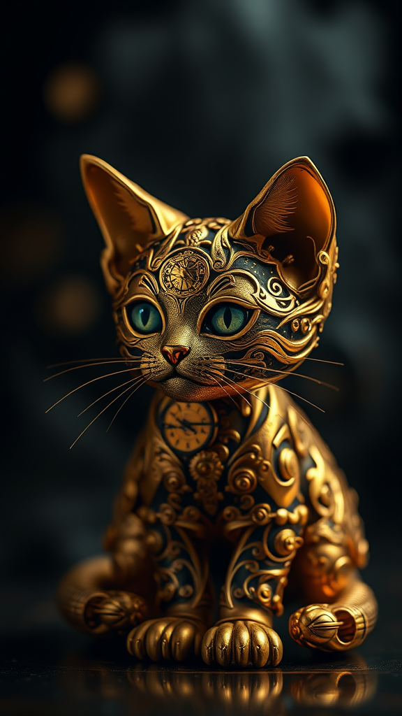 A photorealistic depiction of a gold clockwork kitten detailed in intricate golden filigree, set against an abstract, dark backdrop. The scene captures chiaroscuro lighting, emphasizing high detail and hyper-realism. The image conveys a sense of acceleration, utilizing cinematic techniques and long exposure to enhance depth and dimension. Shot in 8K HD and super-resolution, the composition maintains a balanced 1:1 aspect ratio, highlighting the elegance and complexity of the kitten's design while contrasting beautifully with the moody background.