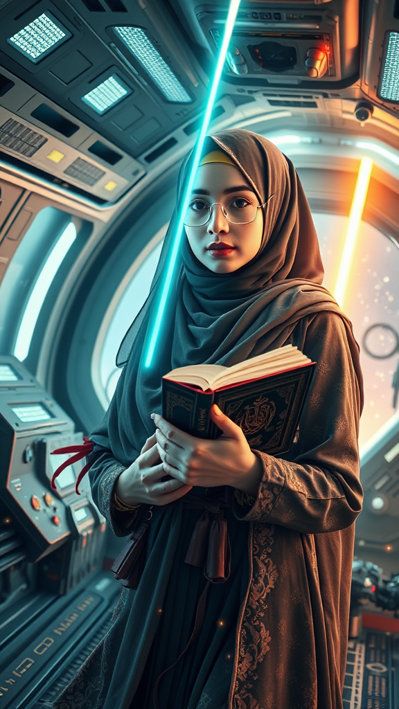 A photorealistic depiction of a hijabi girl showcasing a blend of traditional Islamic attire with cyberpunk-inspired prosthetics, holding a Quran. Her long hair flows gracefully in the futuristic interior of a spaceship. The scene is set in a hyper-detailed sci-fi universe, with a laser beam centered in the composition, cascading down from the sky. Energy clots pulsate around, adding a dynamic element to the scene. The artwork is characterized by a cinematic long-exposure effect, emphasizing acceleration and speed. Rendered in 8K HD, it captures a super-resolution, hyper-realistic view, blending a serene yet high-tech atmosphere.