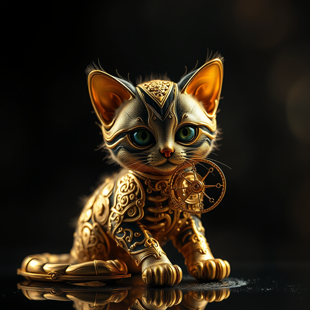 A photorealistic depiction of a kitten crafted from gold, intricately designed in clockwork and adorned with golden filigree, set against an abstract dark backdrop. The scene is enhanced with chiaroscuro lighting, showcasing high detail and hyper-realism. The image captures a sense of acceleration, presented in cinematic style with long exposure, offering super-resolution clarity in 8K HD. The perfectly square aspect ratio adds balance to the composition.