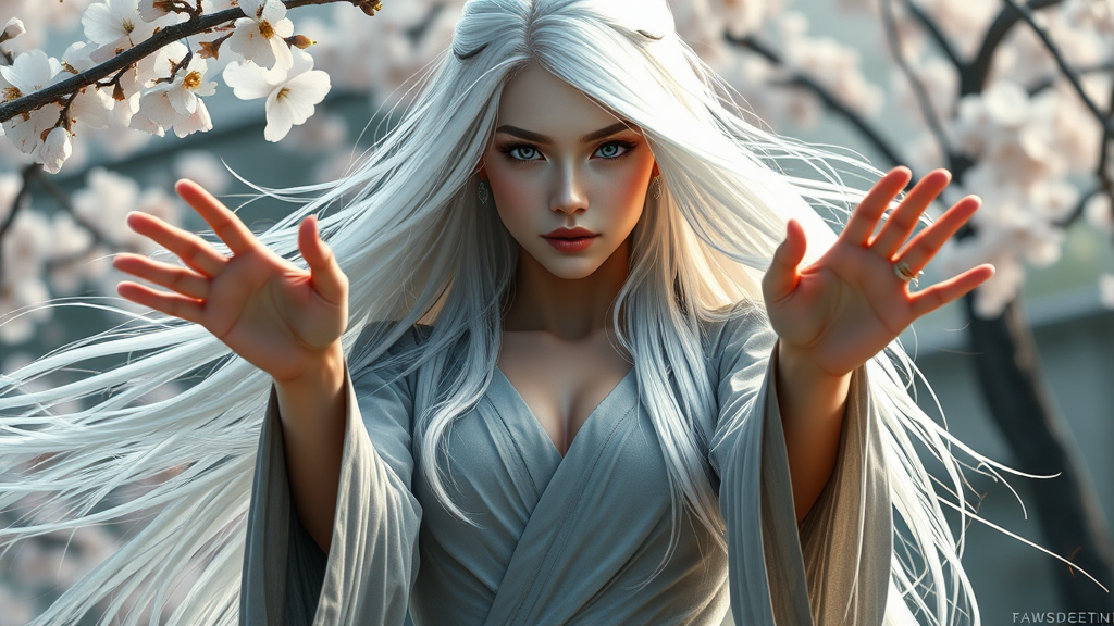 A photorealistic depiction of a stunning young female wizard, her long white hair flowing gracefully in the wind, showcasing a perfect face with an award-winning hairstyle. The realistic hair structure is emphasized in a high-definition style, resembling DeviantArt and ArtStation concepts with a nod to fashion world awards. The torso is elegantly attired in a belly-free dress concept, capturing the essence of detailed face and body photography. She stands in an action pose, hands raised to 90 degrees, against a cherry blossom background infused with elements of Japanese culture. Her intense gaze directly engages the viewer, illuminating her mesmerizing eyes with backlight and embers. The setting includes the dynamic motion of a water splash and mist, enhanced with digital art techniques including ray tracing and glow effects. Rendered in a cinematic, hyperrealistic manner with high attention to intricate details and realistic skin, the creation employs state-of-the-art tools like Cinema 4D and Blender, with octane rendering for a sharp, vivid result. This masterpiece harmoniously integrates concepts from Artgerm, Greg Rutkowski, and Alphonse Mucha, with a focus on highly detailed facial features, hands, and flowing dress, all presented in ultra-realistic 8k quality. The artistic composition is atmospheric, capturing a sense of dynamic energy with vivid colors and depth of field, trending on platforms like Behance for its innovative concept artistry.
