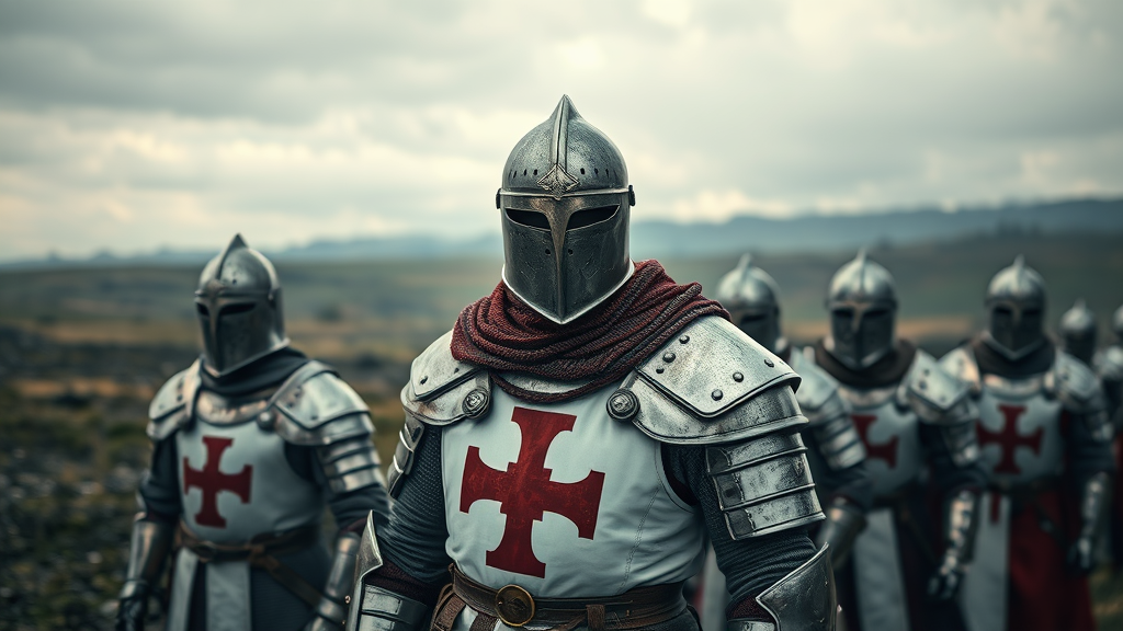 A photorealistic depiction of a Templar knight's armor and helmet, featuring a prominent red cross on the white chestplate, standing resolutely among a line of fellow knights poised for battle. The scene is set against a sprawling, war-torn battlefield under a brooding, overcast sky. The image captures depth of field, providing crisp focus on the knights in the foreground, while the landscape fades softly into the distance. The perspective is akin to a shot taken with a 50mm lens, emphasizing the knight's determined expression and the fine details of the armor. Slightly modified elements include subtle engravings on the armor and faint signs of wear, telling the tale of past battles faced.