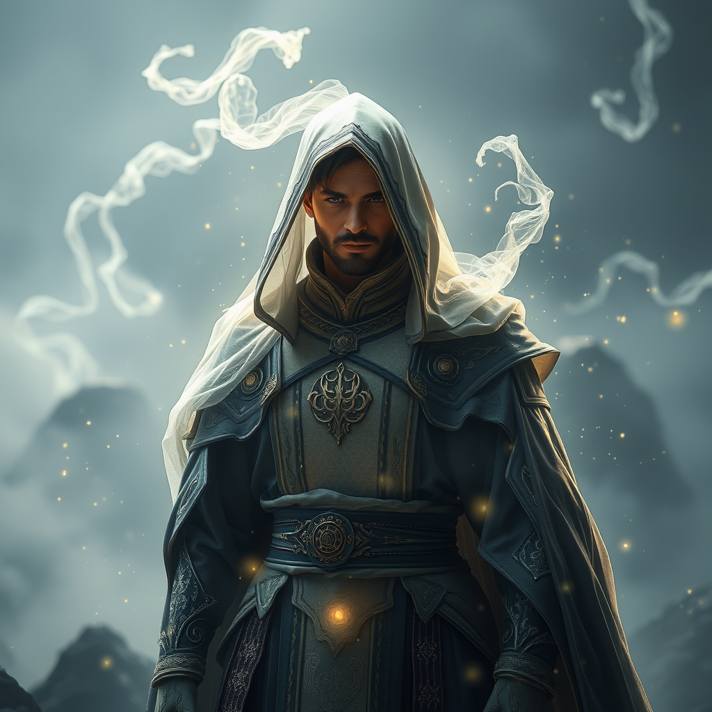 A photorealistic depiction of a void arcanist cloaked in swirling mist, standing in an ethereal realm. The character is designed with intricate details, showcasing elaborate robes adorned with mystical symbols. Volumetric lighting casts an otherworldly glow around them, as particles of shimmering magic dance in the air. The scene is rendered in hyper-realistic detail using octane render and unreal engine, capturing every nuance of the arcanist’s expression and the texture of their garments. The background features a surreal landscape with foggy tendrils snaking through the air, creating a sense of depth and enigma. HDR effects enhance the play of light and shadow, emphasizing the character’s commanding presence in the vertical composition of the scene.