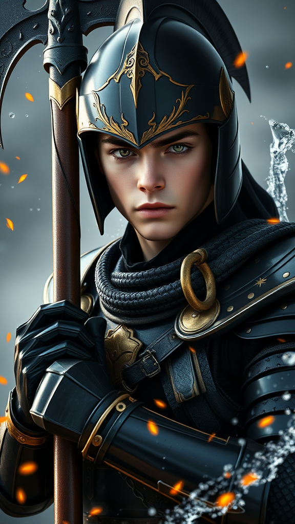 A photorealistic depiction of a young male warrior wearing sleek black armor with elegant golden trim, accompanied by a matching black helmet. His youthful, strikingly handsome face is fully revealed, brimming with charisma and intensity. Created in the style of deviantart and artstation, the concept art boasts award-winning detail, capturing the essence of high-definition photography. The lighting casts a dramatic backlight, enhanced by 12k ultrarealistic ray tracing, which imbues the scene with cinematic allure. With fiery embers floating around and a captivating high fantasy backdrop, the warrior stands in an action-ready pose, his intense gaze locked onto the viewer. His hands, skillfully detailed, hold a formidable battle axe, elevated at a powerful 90-degree angle. A dynamic water splash around the warrior adds to the misty atmosphere, accentuating the scene's vibrancy. Though entirely armored, his detailed face remains visible, presenting an epic, high-detail rendering that avoids any nudity or NSFW content. The background is alive with movement, yet the composition remains refined and non-cropped, ensuring the portrait's elegance and vigor.