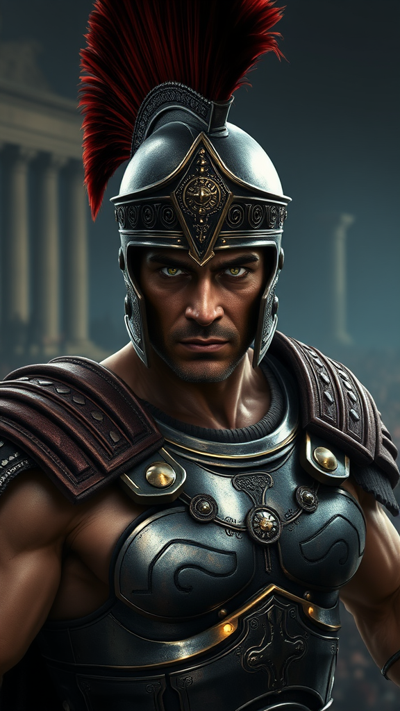 A photorealistic digital illustration depicts a Roman gladiator in a powerful and intense stance, locking eyes with the viewer. The gladiator is wearing a traditional galea helmet, adorned with exquisite engravings and a dark crimson plume. His robust physique is shielded by a lorica segmentata armor, embellished with detailed patterns and a gleaming metallic finish. His piercing eyes exude a fierce, unwavering determination, embodying courage and strength. The background is a dimly lit arena, where the vague silhouettes of the crowd and ancient columns enhance the dramatic and intense ambiance.