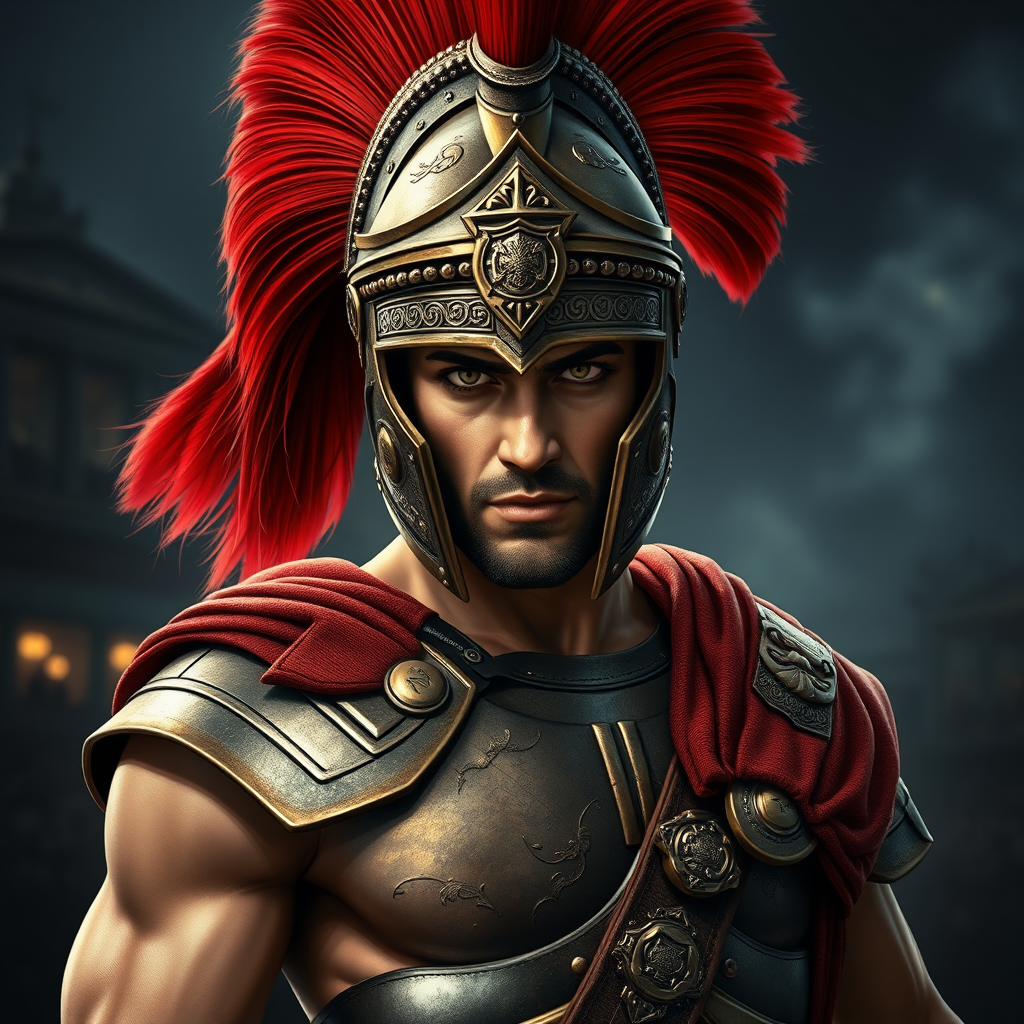 A photorealistic digital illustration of a Roman gladiator, captured in a commanding and intense pose, gazing directly at the viewer with piercing eyes. The gladiator wears a traditional galea helmet with exquisite engravings and a rich, crimson plume flowing in the wind. His muscular physique is shielded by a lorica segmentata armor, showcasing intricate patterns and a polished metallic sheen that reflects the ambient light. His eyes burn with a fierce and unyielding determination, embodying the essence of courage and strength. The background features a dimly lit, atmospheric arena, where the blurred silhouettes of the crowd and the outlines of ancient architecture enhance the dramatic and powerful setting.
