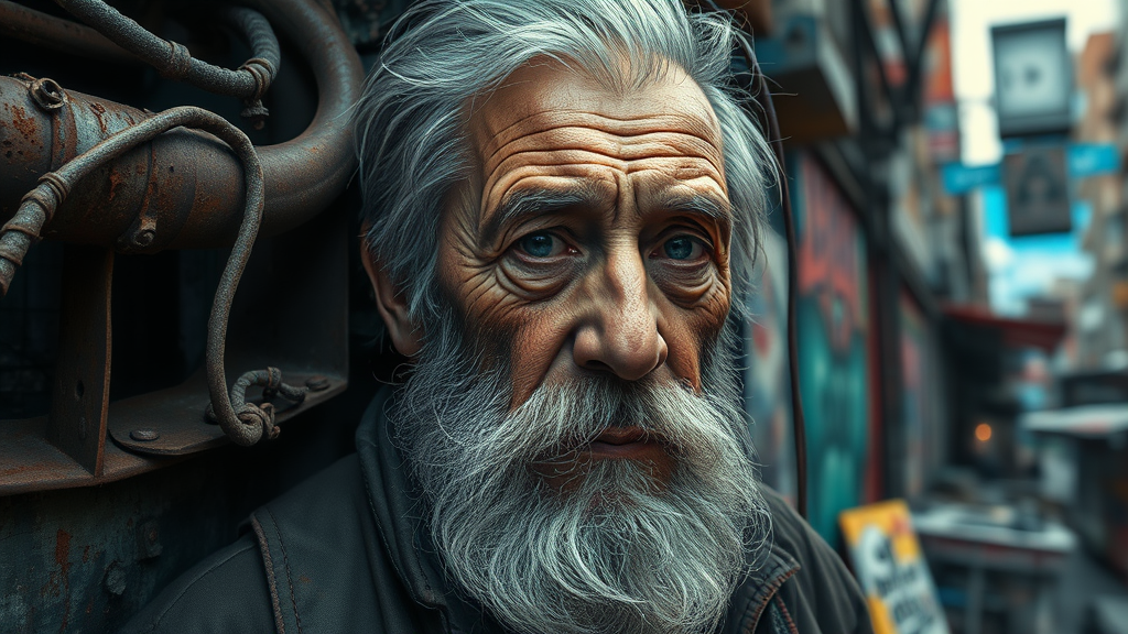 A photorealistic digital painting of an elderly man with a weathered beard and deep-set eyes, surrounded by a vibrant urban scene infused with dark gray tones and hints of algeapunk aesthetics. Rusty metal debris seamlessly blends with the urban landscape, creating a stark contrast with the vivid colors of street art and murals. The portrait is captured in a soft-focus style, emphasizing the man's wisdom and resilience within the bustling city. The composition brings a sense of life to his aged features, as light dances delicately across his skin, evoking a mood reminiscent of artistic portraits found on platforms like Flickr.